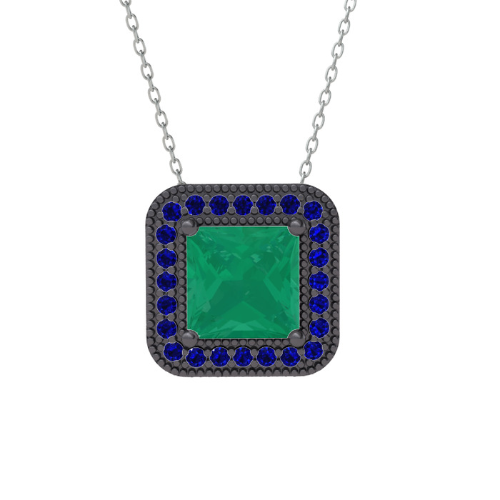Kök zümrüt ve lab safir 925 ayar siyah rodyum kaplama gümüş kolye (40 cm beyaz altın rolo zincir)
