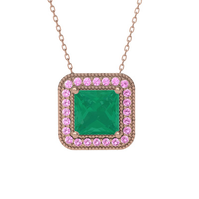 Kök zümrüt ve pembe kuvars 14 ayar rose altın kolye (40 cm rose altın rolo zincir)