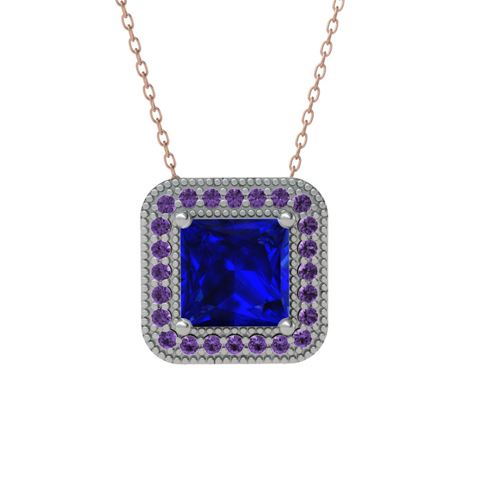 Lab safir ve ametist 8 ayar beyaz altın kolye (40 cm gümüş rolo zincir)