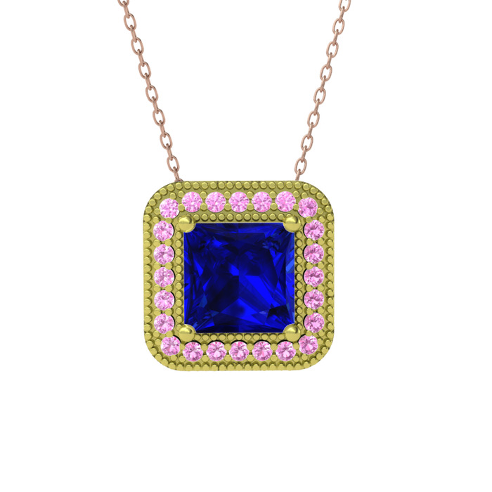 Lab safir ve pembe kuvars 14 ayar altın kolye (40 cm rose altın rolo zincir)