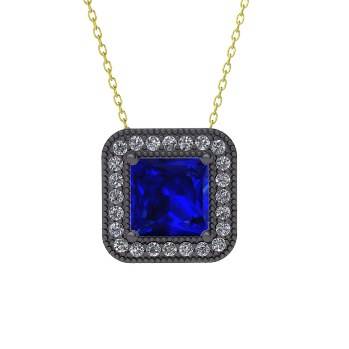 Lab safir ve pırlanta 925 ayar siyah rodyum kaplama gümüş kolye (0.264 karat, 40 cm altın rolo zincir)