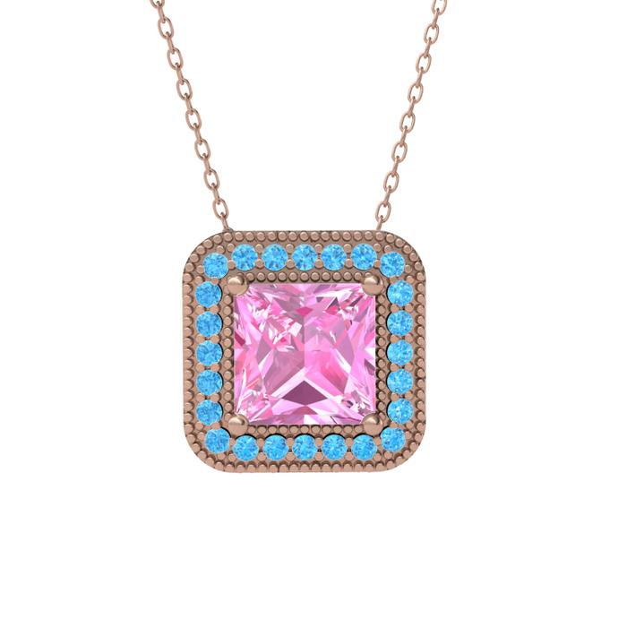 Pembe kuvars ve akuamarin 8 ayar rose altın kolye (40 cm rose altın rolo zincir)