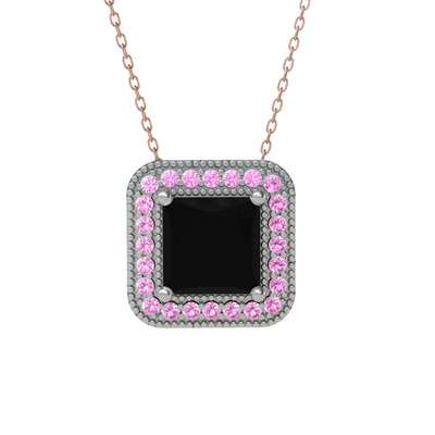 Siyah zirkon ve pembe kuvars 14 ayar beyaz altın kolye (40 cm rose altın rolo zincir)