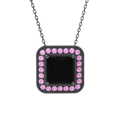 Siyah zirkon ve pembe kuvars 925 ayar siyah rodyum kaplama gümüş kolye (40 cm gümüş rolo zincir)