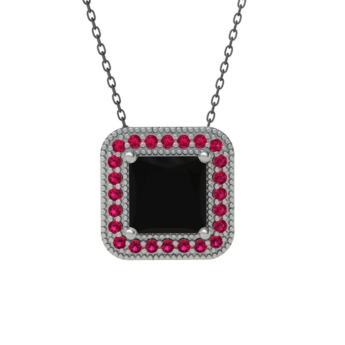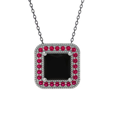 Siyah zirkon ve rodolit garnet 14 ayar beyaz altın kolye (40 cm gümüş rolo zincir)