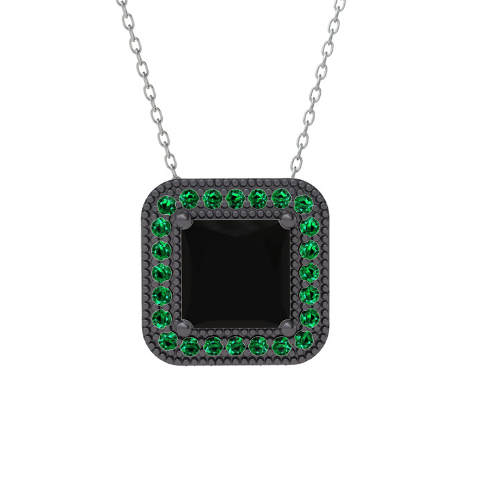 Siyah zirkon ve yeşil kuvars 925 ayar siyah rodyum kaplama gümüş kolye (40 cm beyaz altın rolo zincir)
