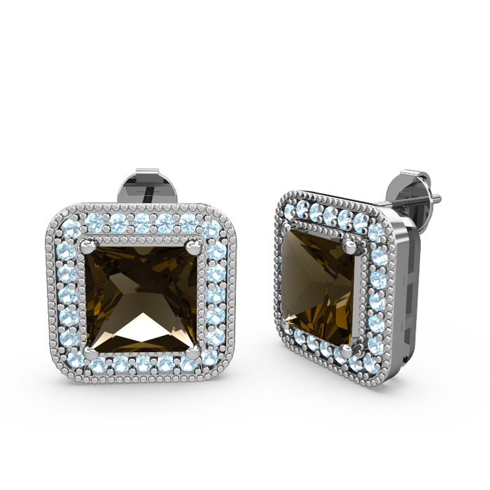 Dumanlı kuvars ve akuamarin 14 ayar beyaz altın küpe