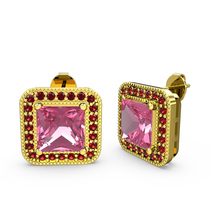 Pembe kuvars ve garnet 18 ayar altın küpe