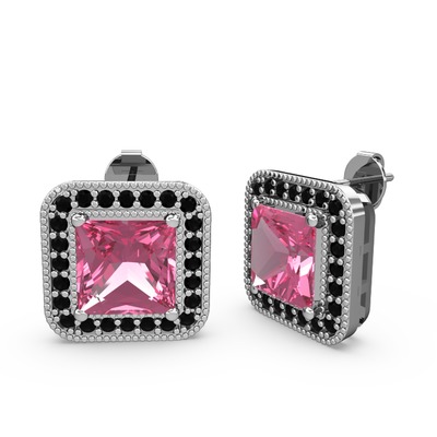 Pembe kuvars ve siyah zirkon 14 ayar beyaz altın küpe
