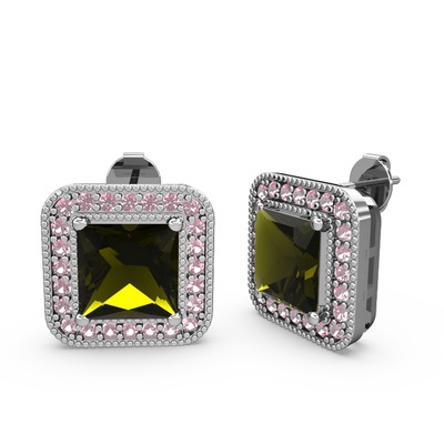 Peridot ve pembe kuvars 18 ayar beyaz altın küpe