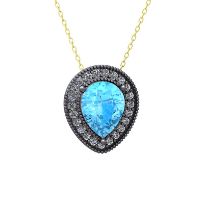 Akuamarin ve beyaz zirkon 925 ayar siyah rodyum kaplama gümüş kolye (40 cm altın rolo zincir)
