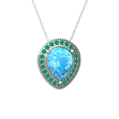 Akuamarin ve kök zümrüt 18 ayar beyaz altın kolye (40 cm gümüş rolo zincir)