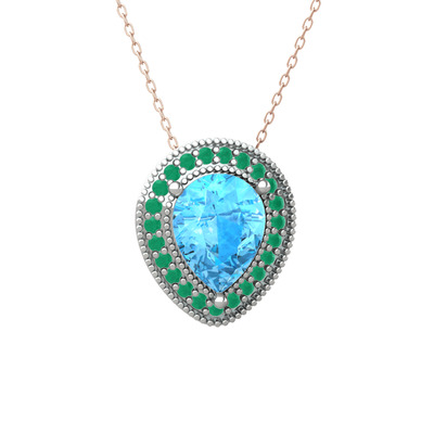 Akuamarin ve kök zümrüt 18 ayar beyaz altın kolye (40 cm rose altın rolo zincir)