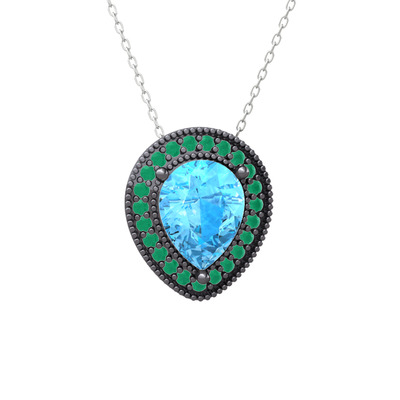 Akuamarin ve kök zümrüt 925 ayar siyah rodyum kaplama gümüş kolye (40 cm beyaz altın rolo zincir)