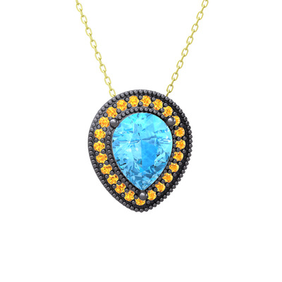 Akuamarin ve sitrin 925 ayar siyah rodyum kaplama gümüş kolye (40 cm gümüş rolo zincir)