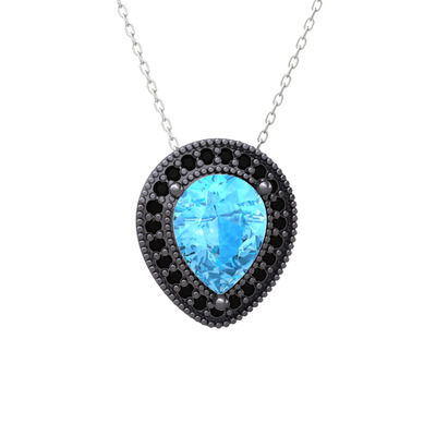 Akuamarin ve siyah zirkon 925 ayar siyah rodyum kaplama gümüş kolye (40 cm beyaz altın rolo zincir)