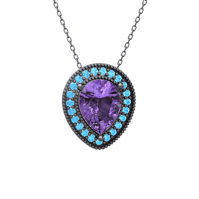 Ametist ve akuamarin 925 ayar siyah rodyum kaplama gümüş kolye (40 cm gümüş rolo zincir)