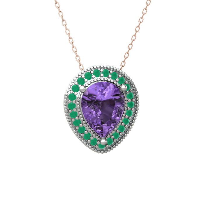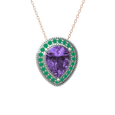 Ametist ve kök zümrüt 14 ayar beyaz altın kolye (40 cm rose altın rolo zincir)