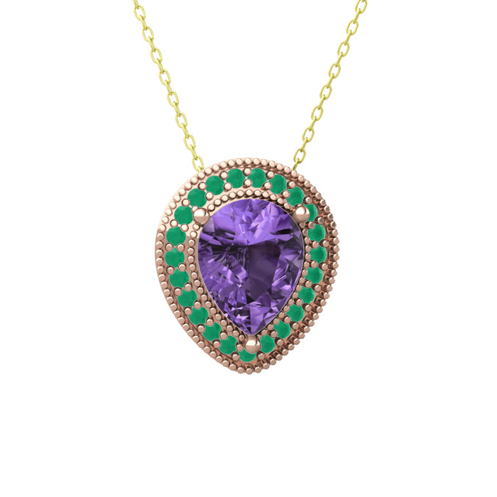 Ametist ve kök zümrüt 925 ayar rose altın kaplama gümüş kolye (40 cm altın rolo zincir)