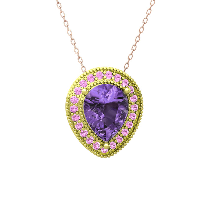 Ametist ve pembe kuvars 14 ayar altın kolye (40 cm gümüş rolo zincir)