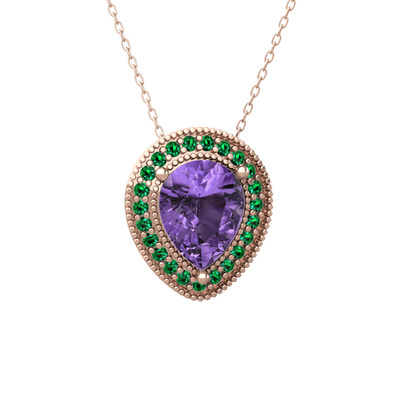 Ametist ve yeşil kuvars 925 ayar rose altın kaplama gümüş kolye (40 cm gümüş rolo zincir)