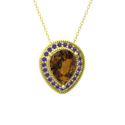 Dumanlı kuvars ve ametist 925 ayar altın kaplama gümüş kolye (40 cm gümüş rolo zincir)