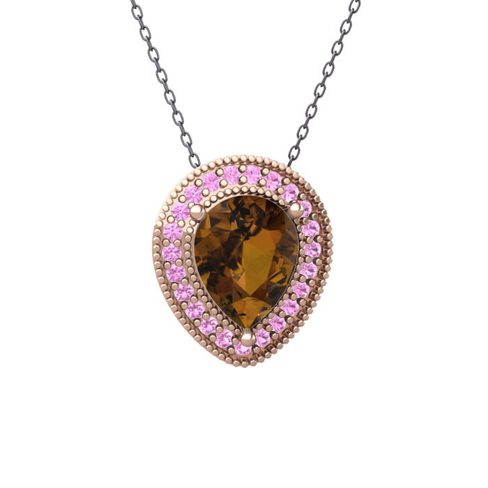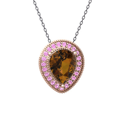 Dumanlı kuvars ve pembe kuvars 14 ayar rose altın kolye (40 cm gümüş rolo zincir)