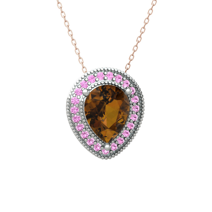 Dumanlı kuvars ve pembe kuvars 8 ayar beyaz altın kolye (40 cm rose altın rolo zincir)