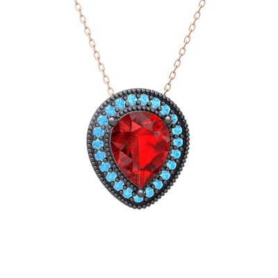 Garnet ve akuamarin 925 ayar siyah rodyum kaplama gümüş kolye (40 cm gümüş rolo zincir)