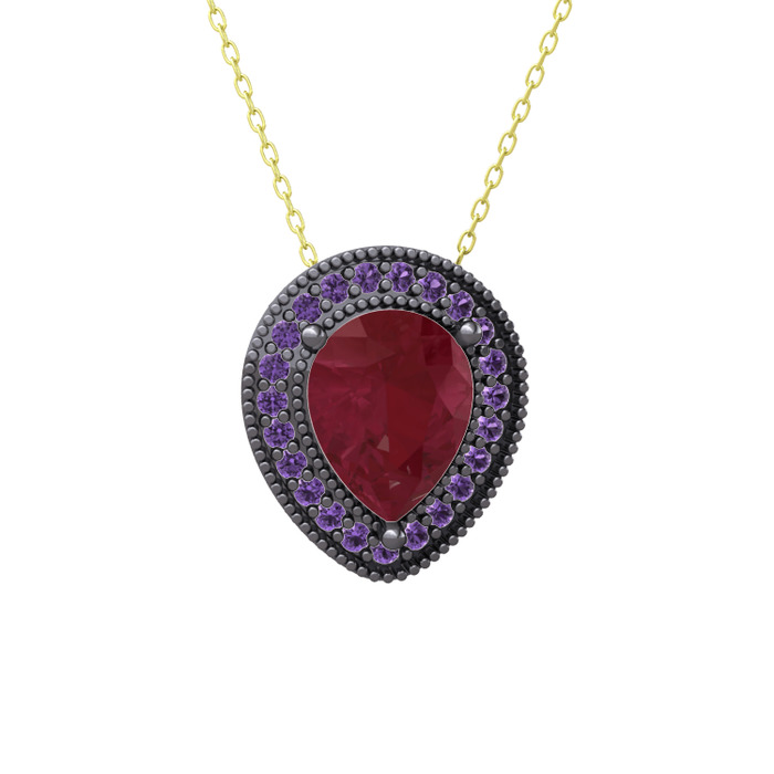 Kök yakut ve ametist 925 ayar siyah rodyum kaplama gümüş kolye (40 cm gümüş rolo zincir)