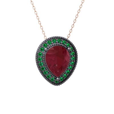 Kök yakut ve yeşil kuvars 925 ayar siyah rodyum kaplama gümüş kolye (40 cm rose altın rolo zincir)
