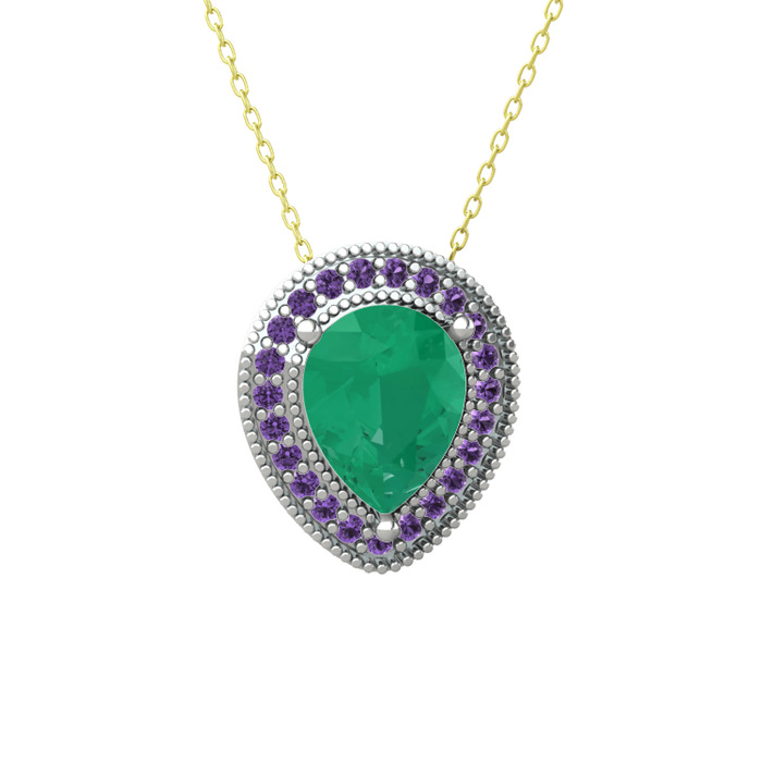 Kök zümrüt ve ametist 14 ayar beyaz altın kolye (40 cm altın rolo zincir)