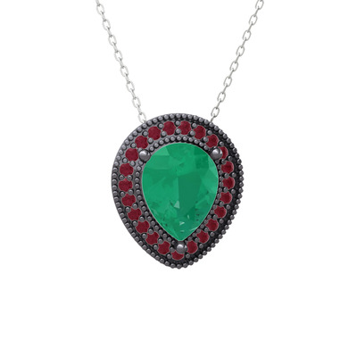Kök zümrüt ve kök yakut 925 ayar siyah rodyum kaplama gümüş kolye (40 cm beyaz altın rolo zincir)