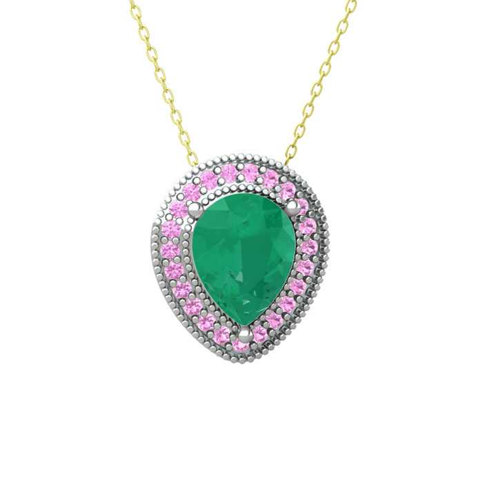 Kök zümrüt ve pembe kuvars 18 ayar beyaz altın kolye (40 cm altın rolo zincir)
