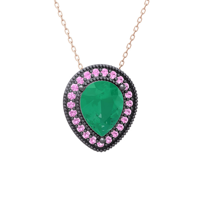 Kök zümrüt ve pembe kuvars 925 ayar siyah rodyum kaplama gümüş kolye (40 cm rose altın rolo zincir)