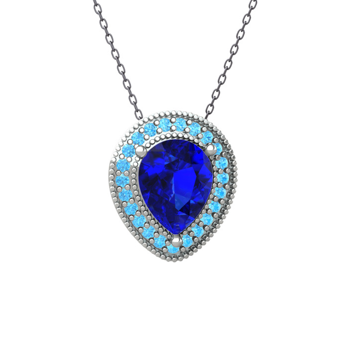 Lab safir ve akuamarin 8 ayar beyaz altın kolye (40 cm gümüş rolo zincir)