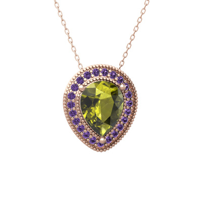 Peridot ve ametist 925 ayar rose altın kaplama gümüş kolye (40 cm rose altın rolo zincir)
