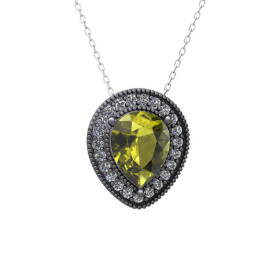 Peridot ve pırlanta 925 ayar siyah rodyum kaplama gümüş kolye (0.264 karat, 40 cm beyaz altın rolo zincir)