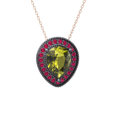 Peridot ve rodolit garnet 925 ayar siyah rodyum kaplama gümüş kolye (40 cm rose altın rolo zincir)