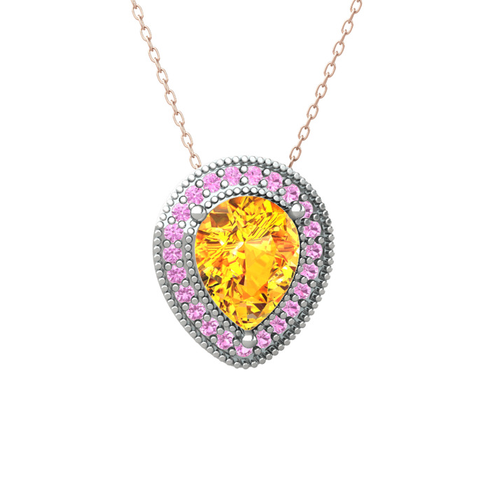 Sitrin ve pembe kuvars 8 ayar beyaz altın kolye (40 cm rose altın rolo zincir)