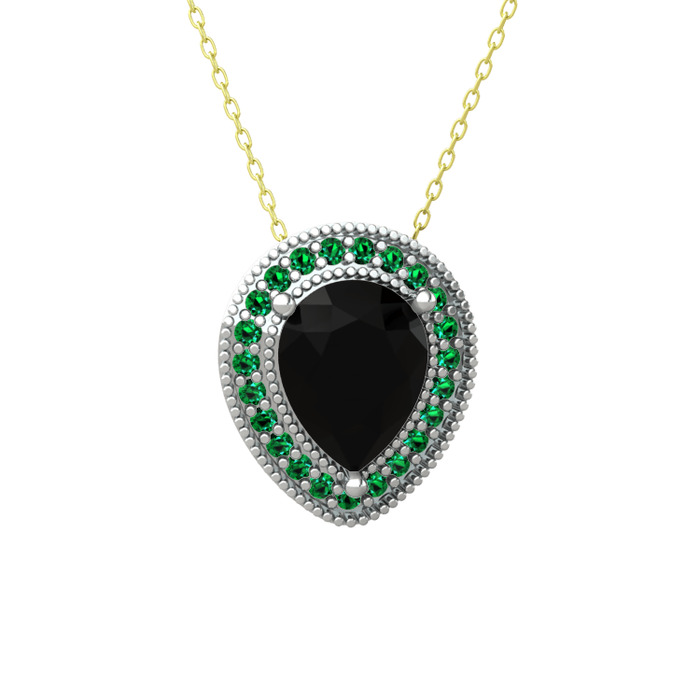 Siyah zirkon ve yeşil kuvars 18 ayar beyaz altın kolye (40 cm gümüş rolo zincir)