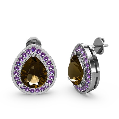 Dumanlı kuvars ve ametist 14 ayar beyaz altın küpe