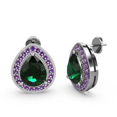 Yeşil kuvars ve ametist 18 ayar beyaz altın küpe