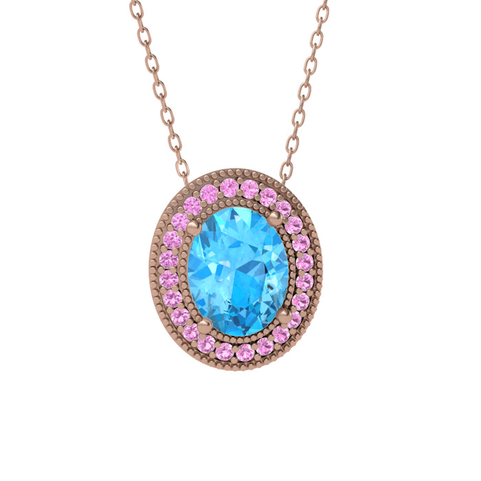 Akuamarin ve pembe kuvars 18 ayar rose altın kolye (40 cm rose altın rolo zincir)