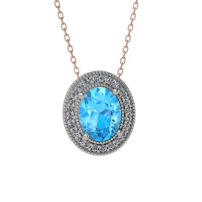Akuamarin ve pırlanta 925 ayar gümüş kolye (0.264 karat, 40 cm rose altın rolo zincir)