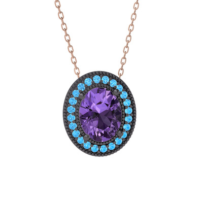 Ametist ve akuamarin 925 ayar siyah rodyum kaplama gümüş kolye (40 cm rose altın rolo zincir)