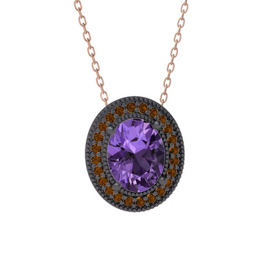 Ametist ve dumanlı kuvars 925 ayar siyah rodyum kaplama gümüş kolye (40 cm rose altın rolo zincir)