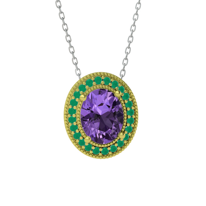 Ametist ve kök zümrüt 18 ayar altın kolye (40 cm gümüş rolo zincir)