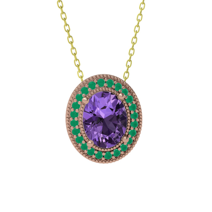Ametist ve kök zümrüt 925 ayar rose altın kaplama gümüş kolye (40 cm altın rolo zincir)