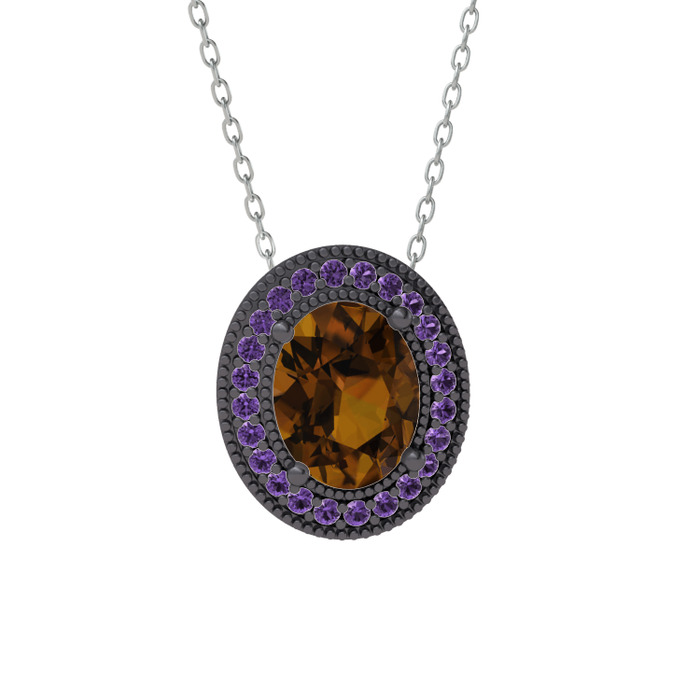 Dumanlı kuvars ve ametist 925 ayar siyah rodyum kaplama gümüş kolye (40 cm gümüş rolo zincir)